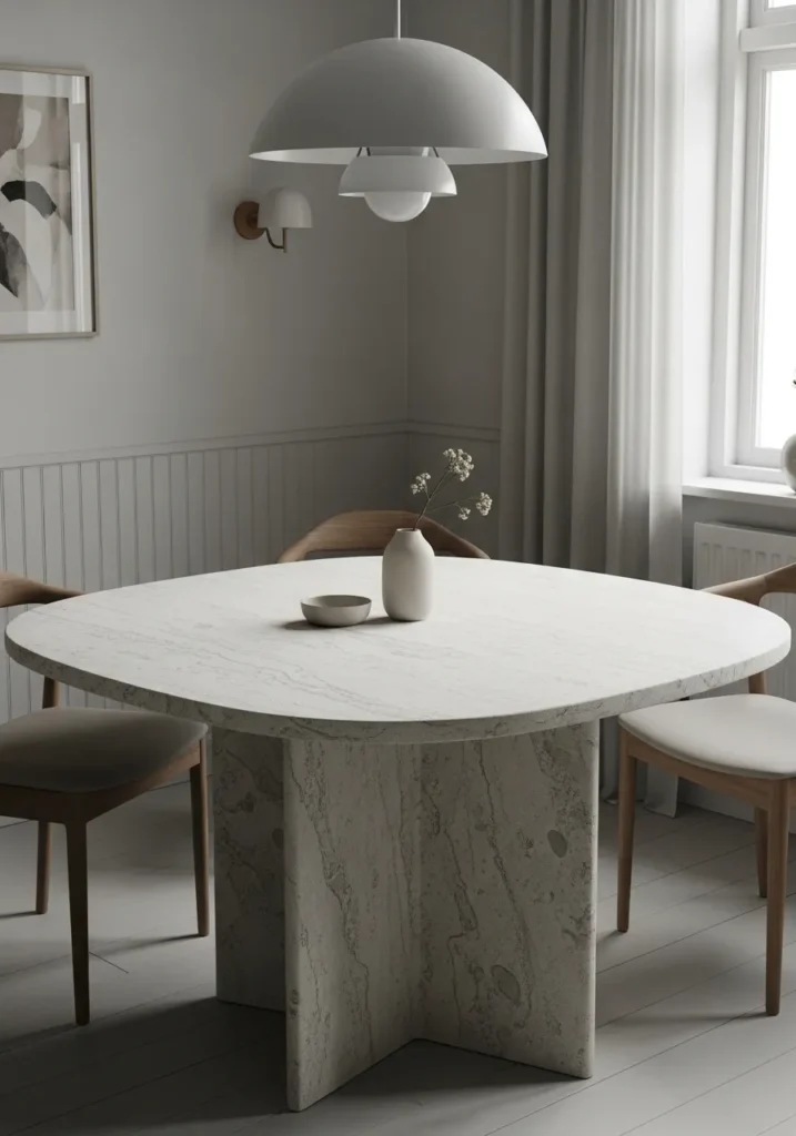 This dining table features a smooth rounded marble top paired with a solid sculptural base. The gentle curves soften the look and make the space feel calm and inviting. Light colors keep everything airy while still feeling substantial. It fits perfectly into a modern dining area without feeling too sharp or strict.