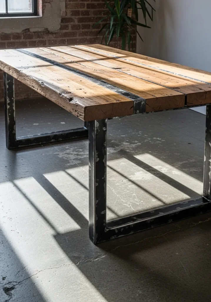 This dining table blends rough wood planks with a strong metal frame for an industrial look. The surface shows natural imperfections and texture, which adds so much character. The dark metal legs ground the table and give it a sturdy feel. It looks like it belongs in a creative loft or a modern farmhouse.
