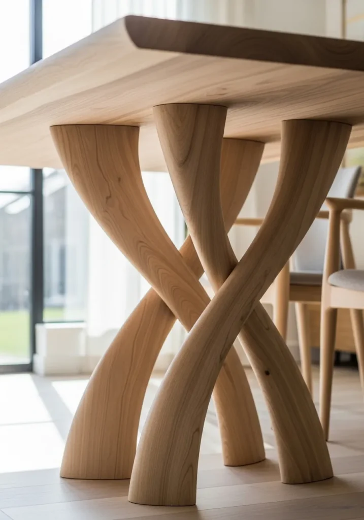 This dining table stands out immediately thanks to its sculptural curved wooden base. The smooth flowing shapes create a sense of movement and artistry while still feeling grounded. Paired with a simple tabletop, the base becomes the main design feature. Light wood keeps the overall look airy and modern.
