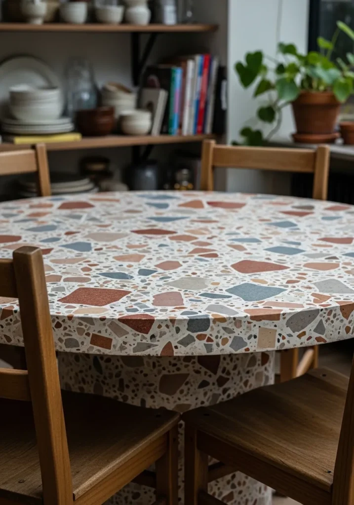 This dining table uses a terrazzo top filled with colorful stone pieces for a fun and creative look. The pattern adds energy while the simple base keeps it grounded. It feels cheerful and relaxed, perfect for a casual dining space. The mix of colors makes the table feel lively without being overwhelming.