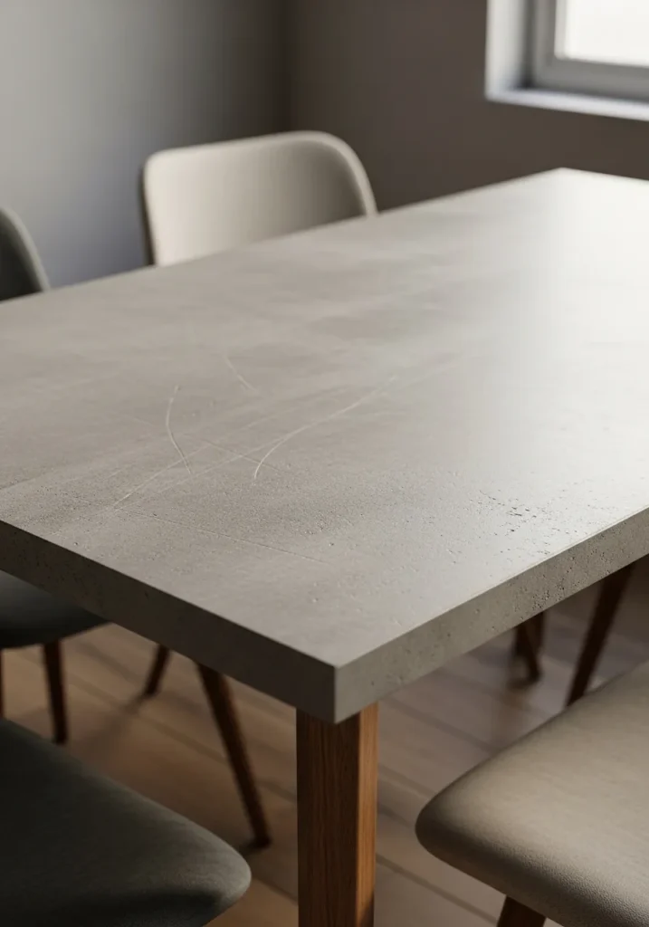 This dining table blends a smooth concrete surface with warm wooden legs for a look that feels modern but still inviting. The tabletop has a soft matte finish with subtle texture that adds depth without feeling rough. Clean edges keep the design sharp while the wood base brings balance and warmth. It feels minimal yet thoughtful, perfect for a calm and contemporary dining space.