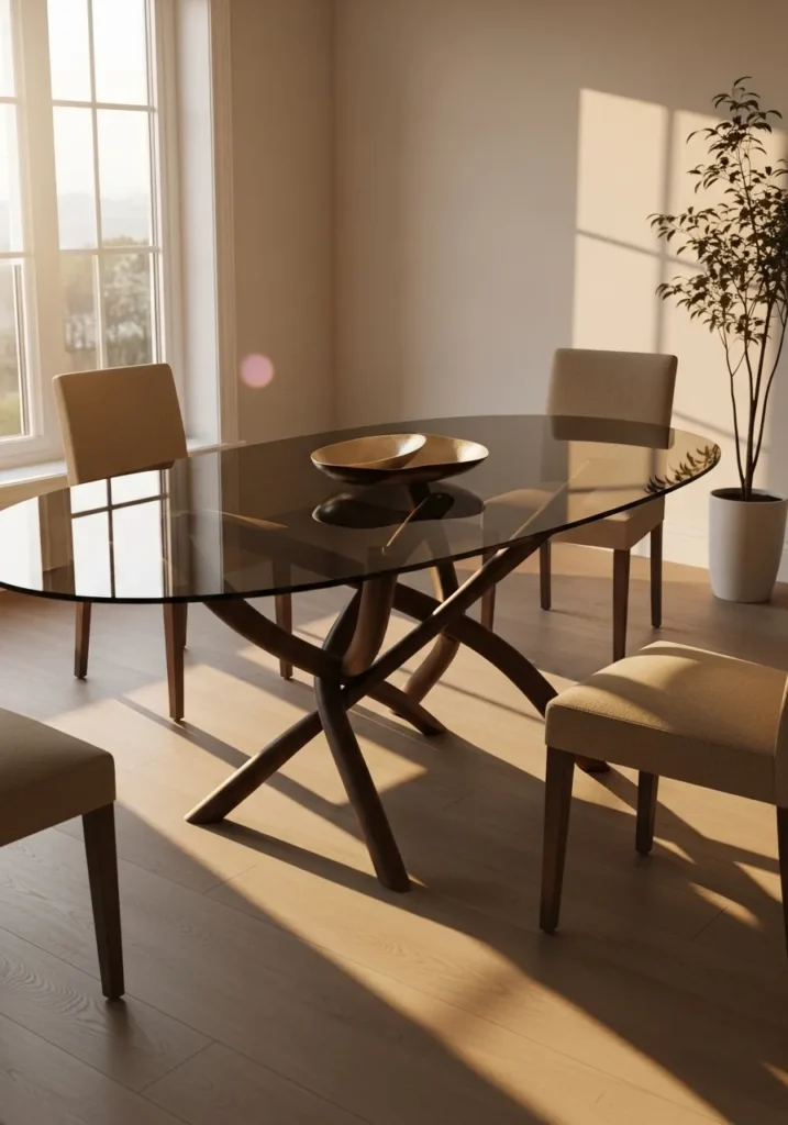 This dining table plays with light in such a beautiful way thanks to the glass top. The sculptural base underneath adds interest without overpowering the space. Sunlight passes right through the surface and makes the whole room feel open and fresh. It almost disappears visually while still making a strong design statement.