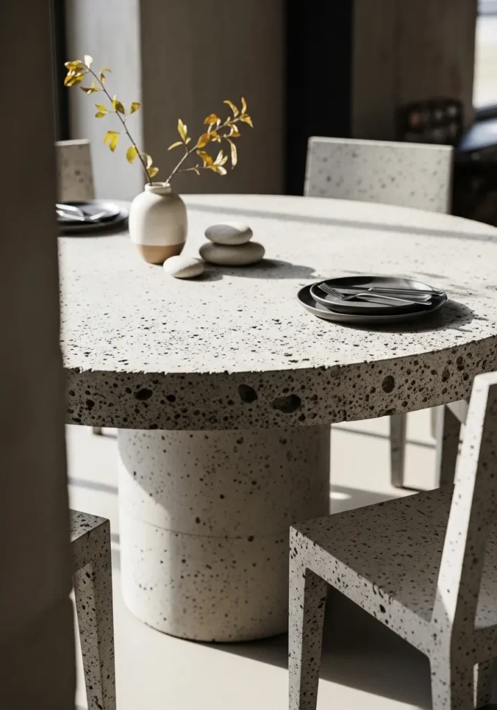 This dining table pairs a smooth tabletop with a warm toned terrazzo base that adds subtle texture. The speckled surface gives it depth and visual interest without overwhelming the space. Soft light makes the colors feel gentle and earthy. The overall shape feels solid and calm.