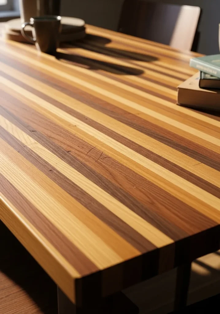 This dining table stands out instantly thanks to the striped wood pattern across the surface. Different tones of wood are blended together to create a rich layered look. The finish feels smooth and warm and the overall shape stays simple to let the material shine. It feels bold but still grounded.