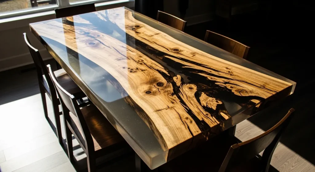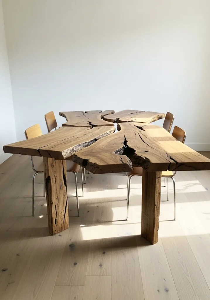 This table celebrates natural wood in the most dramatic way. The live edge slabs meet in the center to create a bold organic shape that feels almost sculptural. Every crack and grain line adds character and makes the table feel one of a kind. The sturdy wooden base keeps the design grounded while letting the top be the star.