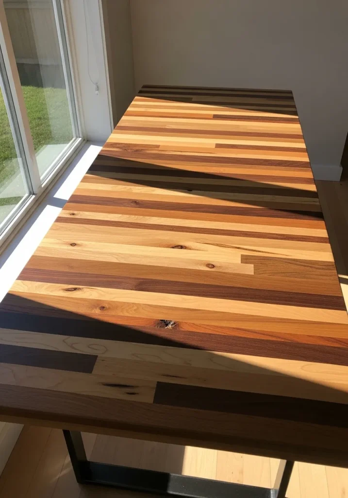 This dining table uses mixed wood planks to create a rich patchwork surface full of warmth. Different shades and grains come together in a way that feels casual but intentional. Sunlight hits the surface and highlights every variation, giving the table so much depth. The simple base keeps the focus on the top.