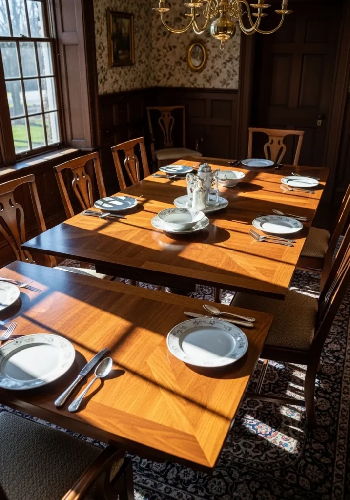 This dining room showcases a rich wood extendable table set for a full dinner gathering. Warm lighting and traditional chairs give the space a cozy and slightly nostalgic feel. The extension allows for generous seating while keeping the table sturdy and grounded. Everything feels ready for long meals and meaningful conversations.