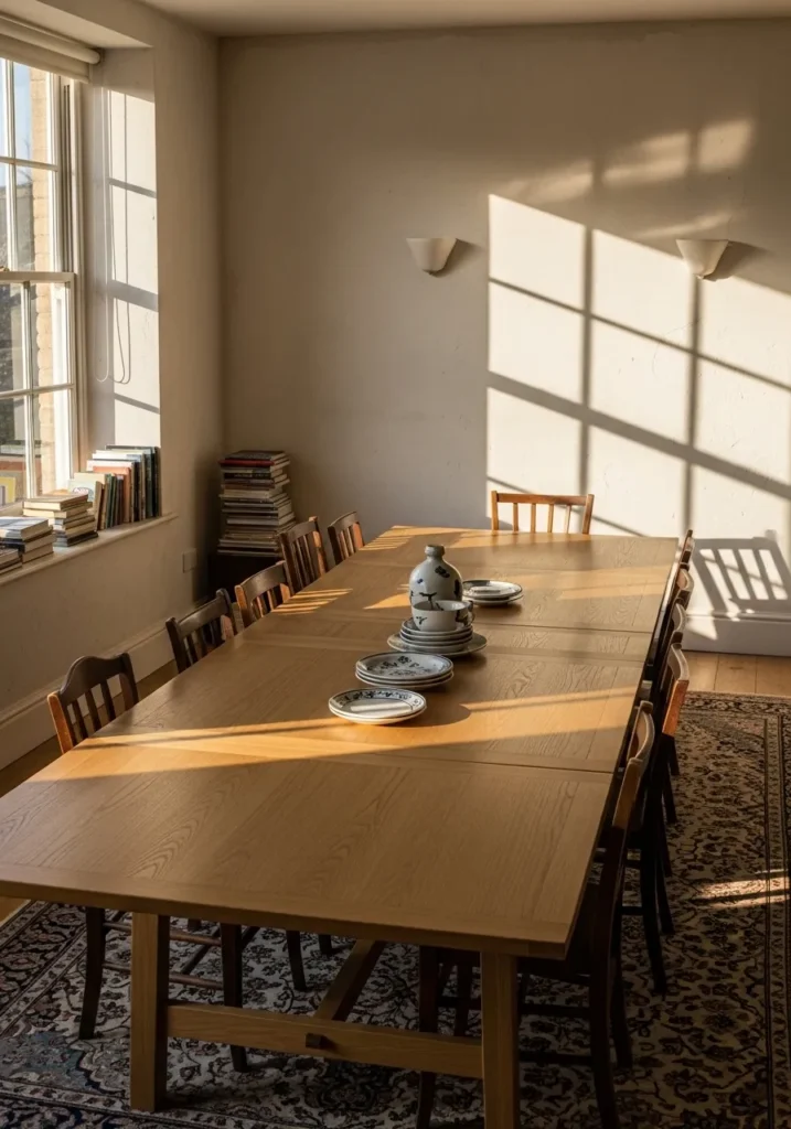 This space highlights a long extendable dining table placed in a bright room with generous natural light. The table stretches beautifully across the space, offering plenty of seating while still feeling balanced. Simple wooden chairs keep the look cohesive and practical. The extension turns the table into a true hosting centerpiece.
