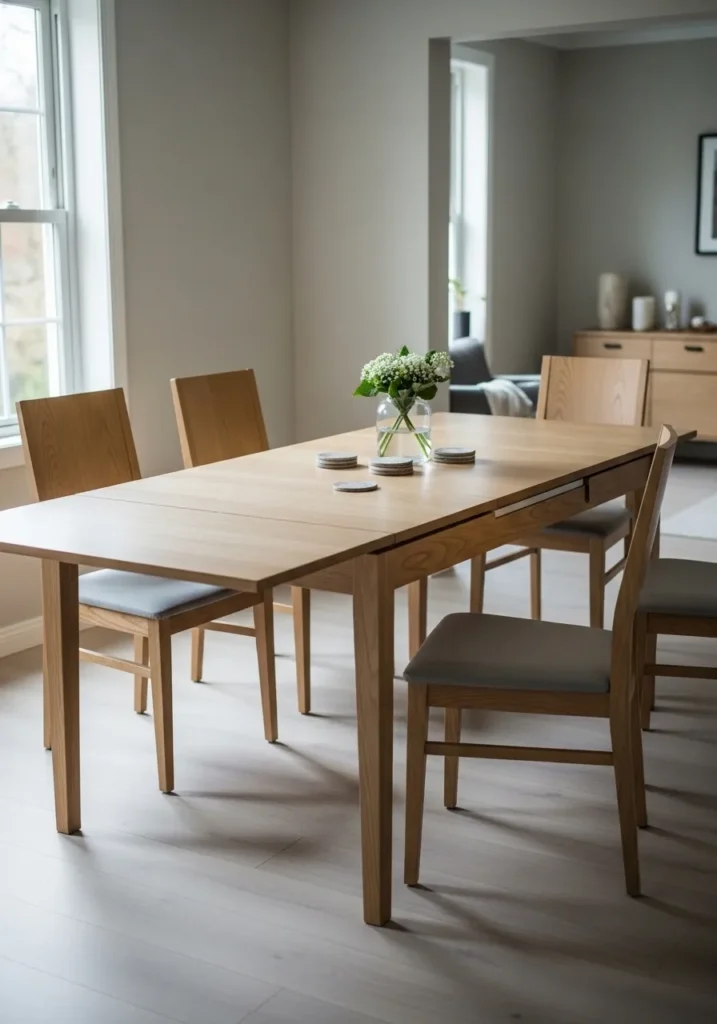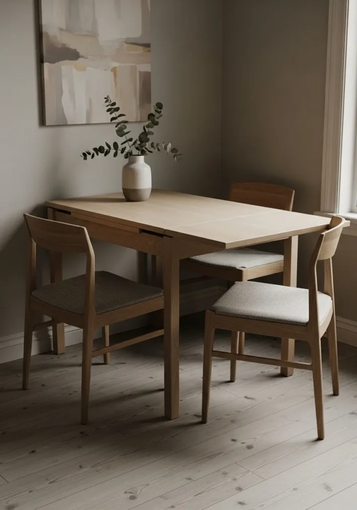 This dining area features a smaller extendable table tucked neatly into a cozy corner. Light wood tones and matching chairs create a soft and harmonious look. The extension allows the table to grow when needed without dominating the space. Everything feels intentional and well scaled.