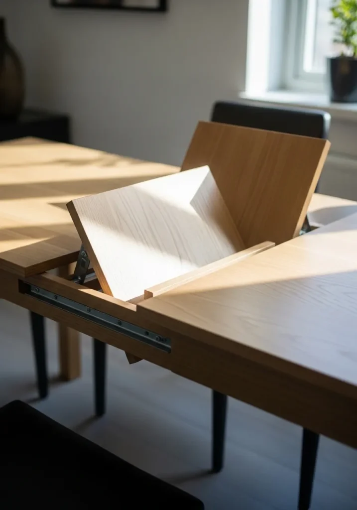 This close up view focuses on a table with a built in leaf extension that lifts smoothly from the center. The mechanism feels smart and intuitive while keeping the table surface clean. The light wood finish keeps everything feeling bright and modern. It is functional without sacrificing style.