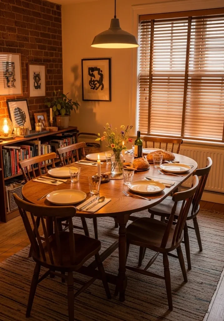 This dining room features a round extendable table set for an intimate evening meal. Warm lighting, wood chairs, and layered textures create a cozy and inviting atmosphere. The extension allows the table to accommodate more guests while keeping its friendly shape. The room feels personal and full of character.