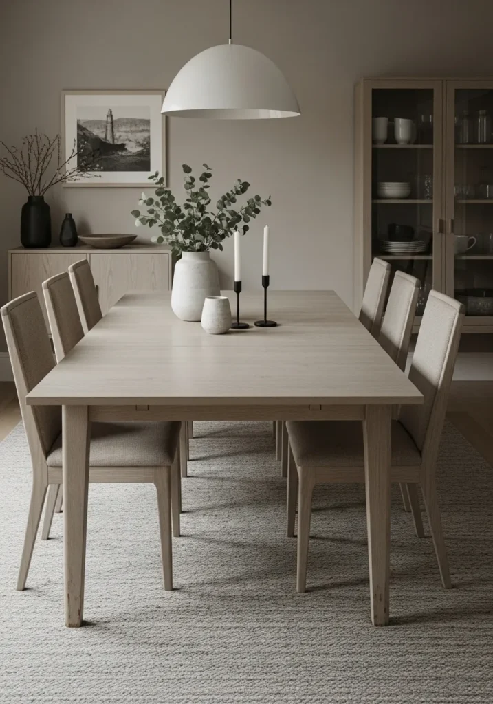 This dining space features a light toned extendable table paired with matching chairs and a soft neutral palette. The clean lines and subtle textures create a calm and balanced look that feels very Scandinavian inspired. A simple pendant light and minimal decor keep the focus on the table itself. The extension blends in effortlessly, making the table look polished at any size.