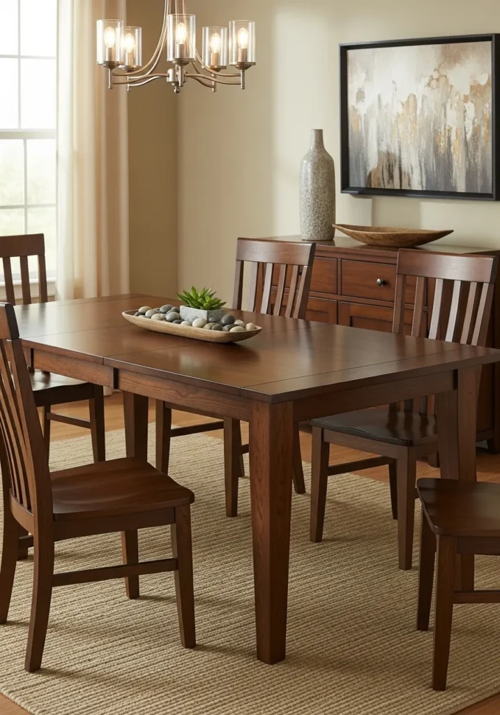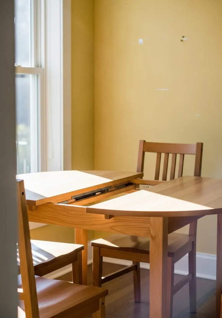 This design highlights a smaller extendable table that works perfectly in a modest dining area. The extension leaf pulls out smoothly, allowing the table to grow when needed. Simple wooden chairs and a warm wall color add personality without crowding the space. Natural light keeps the room feeling open and comfortable.