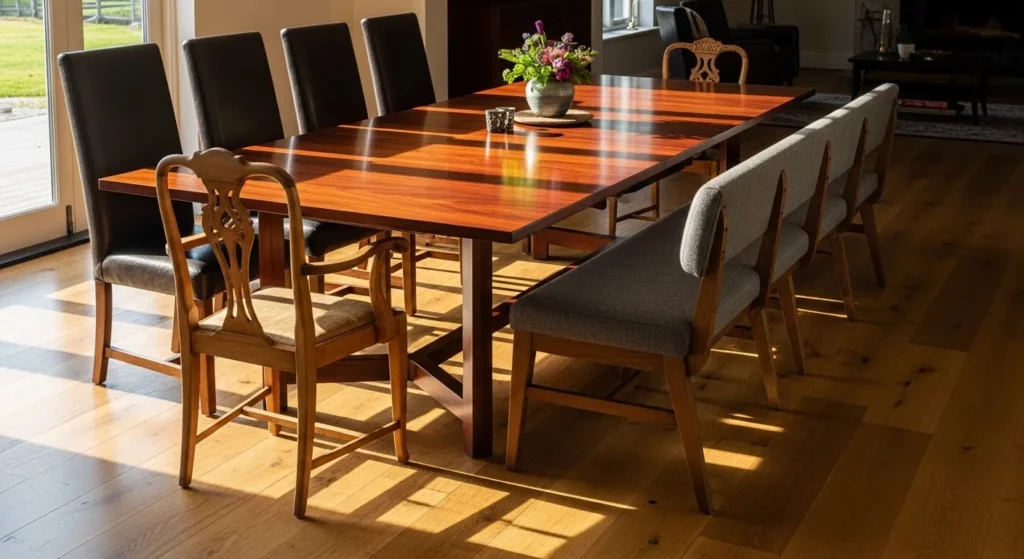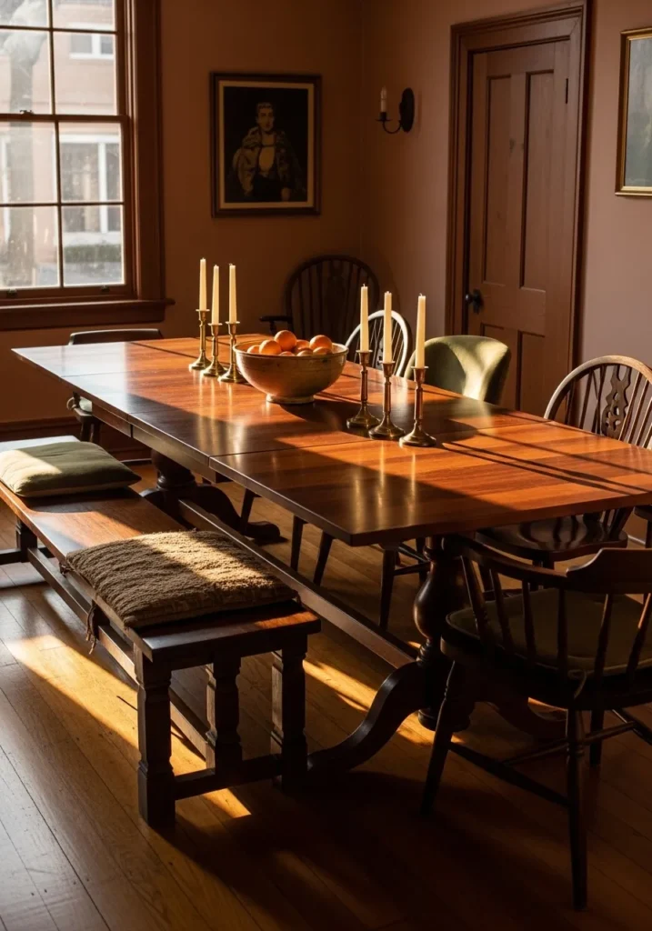This dining room centers around a darker wood extendable table with a slightly rustic feel. Mixed seating and warm accents add character and depth to the space. The extension allows the table to handle larger gatherings while keeping its solid presence. Sunlight adds a beautiful glow to the wood surface.