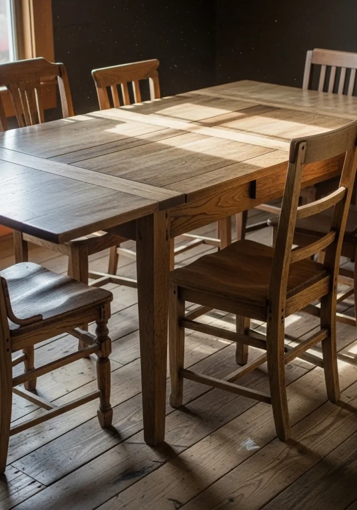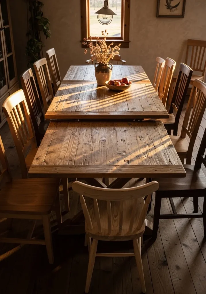 This space showcases a rustic extendable dining table with visible wood grain and a sturdy build. The chairs add to the farmhouse feel, and the slightly worn look of the wood brings warmth and character. Natural light highlights the texture of the table, making it feel lived in and welcoming. The extension adds flexibility without taking away from the charm.