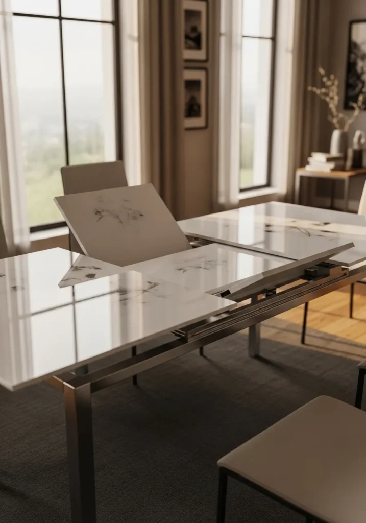 This dining area features a modern extendable table with a glass top and slim metal legs. The extension mechanism is visible yet elegant, adding a contemporary edge to the design. Light reflects off the glass surface, making the room feel open and stylish. The surrounding decor stays minimal to let the table shine.