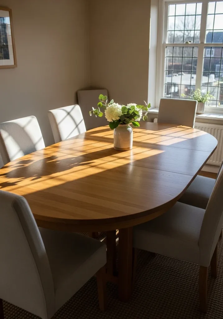 This dining space features an oval extendable table in a warm wood finish that feels gentle and inviting. The rounded shape softens the room and works beautifully with the upholstered chairs placed around it. Sunlight streams in through the window, creating natural highlights across the tabletop. The extension keeps the oval shape intact, which makes the table feel thoughtful and well designed.