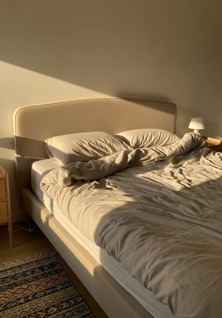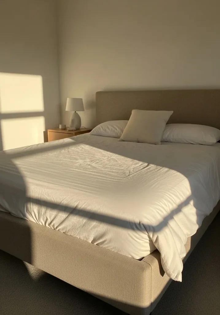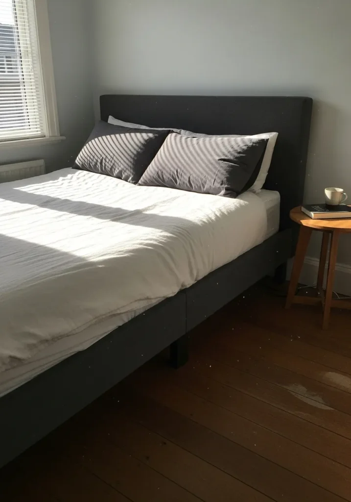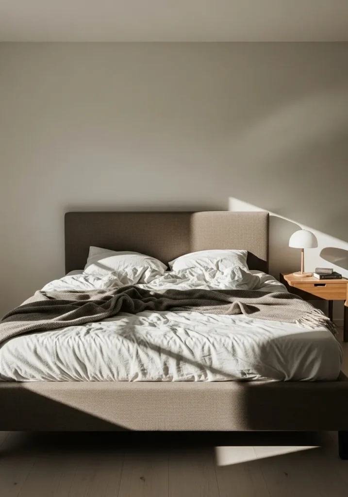 This bedroom feels calm and grounded with a fabric bed frame in a warm neutral tone that blends effortlessly into the space. The upholstered headboard keeps things simple and cozy, while crisp white bedding adds a fresh and airy feel. Morning light stretches across the bed and walls, creating soft shadows that highlight the texture of the fabric and give the room a gentle glow. A small wooden nightstand and simple lamp add just enough warmth without distracting from the bed.
