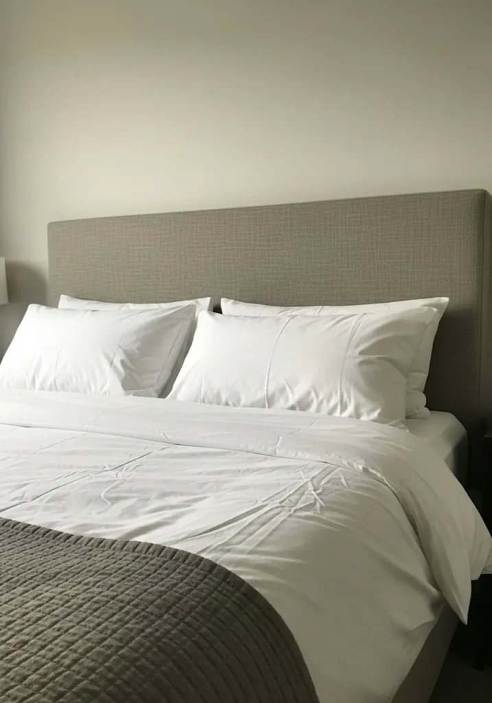 This bedroom keeps things polished and serene with a wide fabric headboard in a soft neutral shade that feels both modern and inviting. Crisp white bedding brings a clean look, while the subtle texture of the upholstery adds warmth without visual clutter. A simple quilt folded at the foot of the bed adds depth, and the uncluttered walls let the bed frame shine as the main feature. Everything feels balanced and intentionally simple.