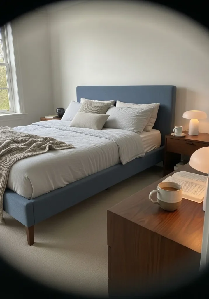 I really love how real and comforting this setup feels. It looks like the kind of bed you actually want to crawl back into after making coffee. The fabric frame softens the whole room and makes it feel warm without trying too hard. This is the kind of bedroom that feels peaceful and welcoming every single day.