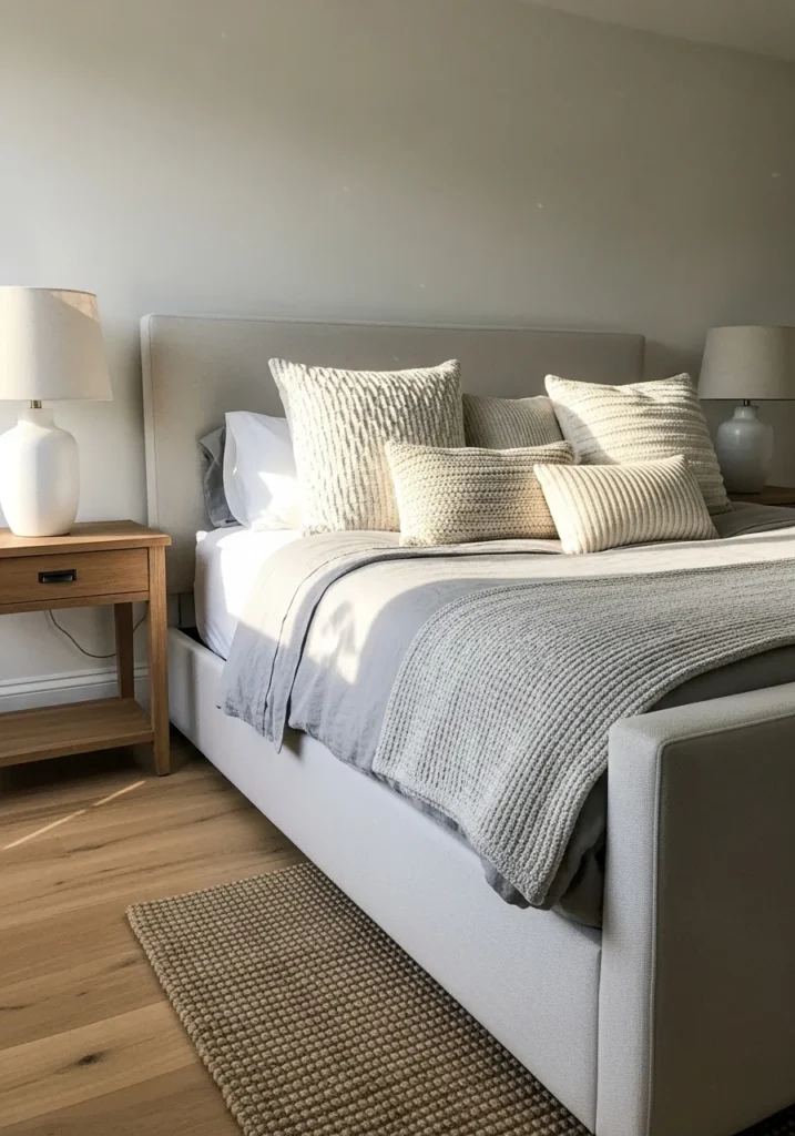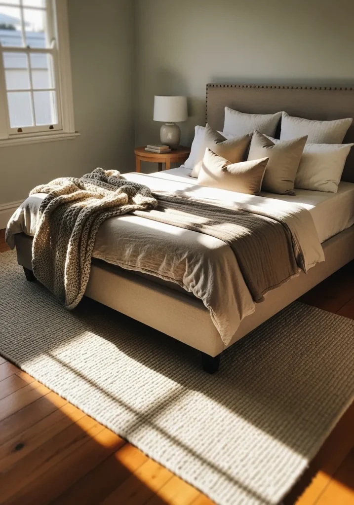 This bedroom feels calm and welcoming thanks to a soft fabric bed frame in a light neutral shade that blends easily with the rest of the space. The padded headboard adds comfort without overpowering the room, while layers of textured pillows and a cozy knit blanket bring depth and warmth. Light wood furniture and a woven rug keep the look grounded and natural, and the gentle daylight makes everything feel relaxed and lived in.