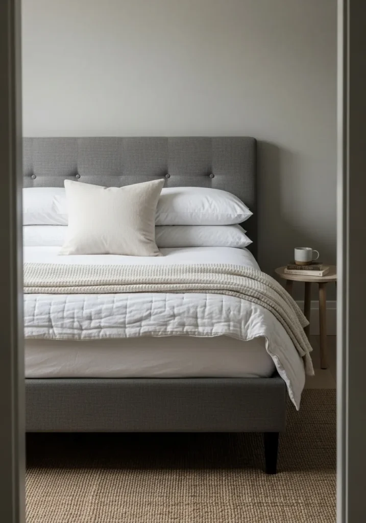 This bedroom keeps things simple and polished with a structured gray fabric bed frame that feels calm and timeless. The button tufted headboard adds just enough detail without feeling busy, while crisp white bedding and layered textures keep the look soft and welcoming. Neutral walls and a woven rug ground the space, and the small wooden side table brings in a touch of warmth that stops the room from feeling too stark.