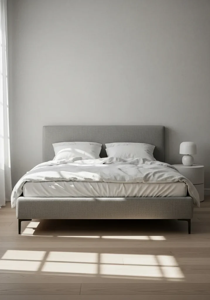 Airy Minimal Bedroom With a Soft Gray Fabric Bed