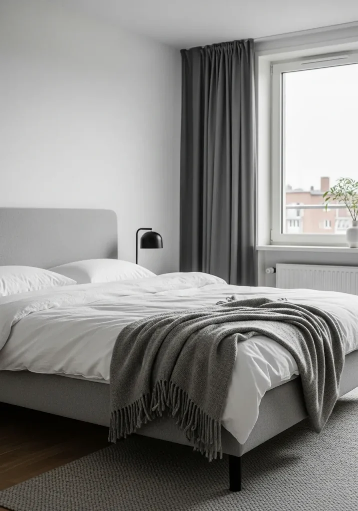 This bedroom feels calm and easy with a soft gray fabric bed frame that blends beautifully into the neutral palette. The upholstered headboard keeps the look cozy without adding bulk, while crisp white bedding and a casually draped throw bring in softness and texture. Dark curtains add contrast and help frame the natural light coming in through the window. Simple lines and minimal decor keep the space feeling open and uncluttered.