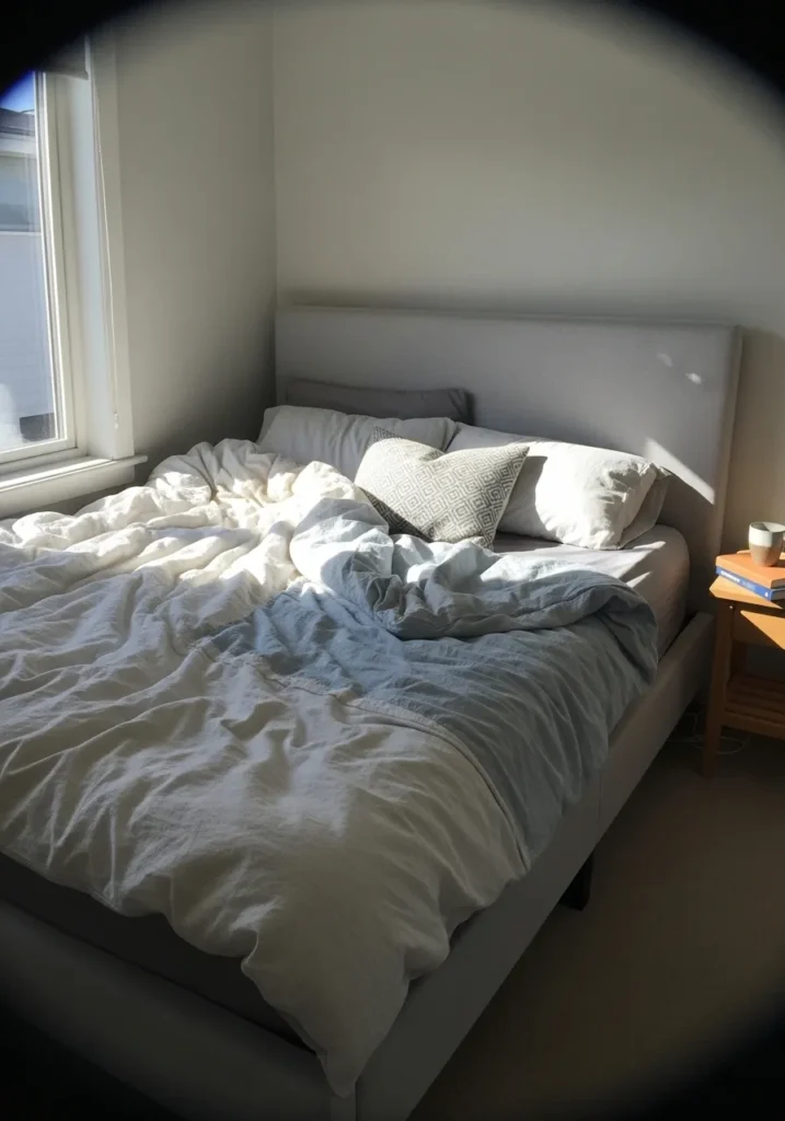 I can totally picture sinking into this bed at the end of a long day. It feels cozy but still refined, like the kind of room that always looks good without much effort. The fabric bed frame makes the space feel warmer and more personal, and those sunlit shadows honestly do half the decorating work. This is the kind of bedroom that makes staying in feel like a treat.