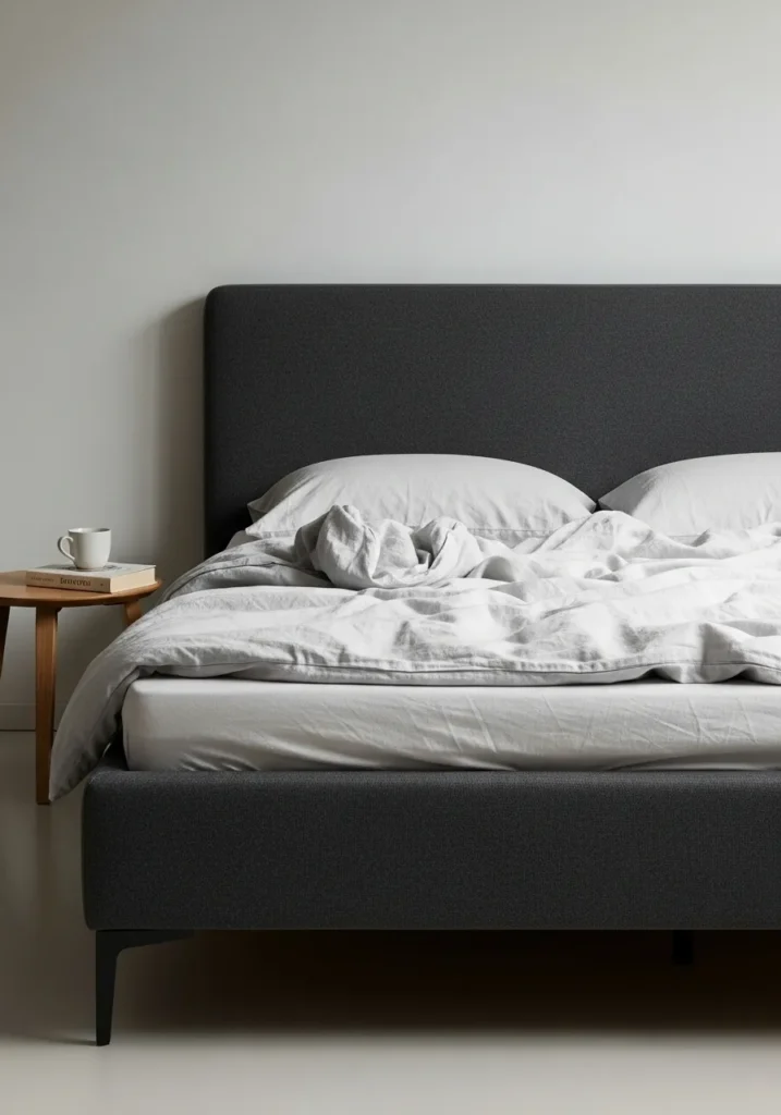 This bedroom keeps things sleek and calm with a dark fabric bed frame that adds depth without feeling heavy. The smooth upholstered headboard creates a strong backdrop for soft white bedding, which keeps the whole space feeling fresh and balanced. Clean walls and minimal decor let the textures do the talking, while the small wooden side table adds a subtle touch of warmth that softens the darker tones.