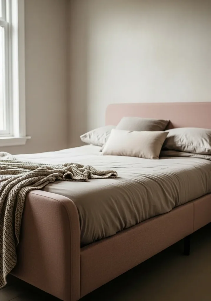 This bedroom brings in a gentle pop of color with a blush fabric bed frame that still feels calm and understated. The smooth upholstery and rounded corners give the bed a modern look without feeling stiff. Neutral bedding keeps the palette balanced, while the knit throw casually draped at the foot adds texture and warmth. Natural light from the window softens the pink tone and makes the whole room feel airy and relaxed.