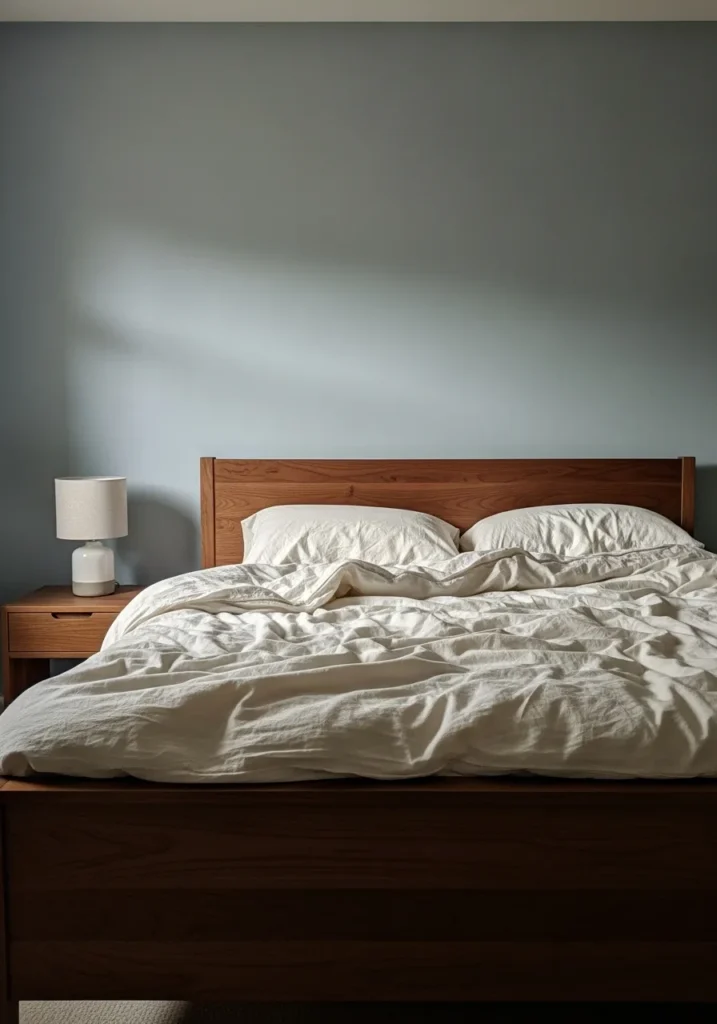 This bedroom keeps things serene with a warm walnut bed frame set against a soft muted wall color that feels calm and grounding. The simple headboard shows off the natural wood grain without any fuss, while crisp white bedding adds contrast and a relaxed lived in look. A matching walnut nightstand and a small lamp keep the setup balanced and practical, making the room feel cozy without feeling crowded.