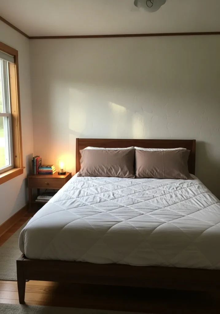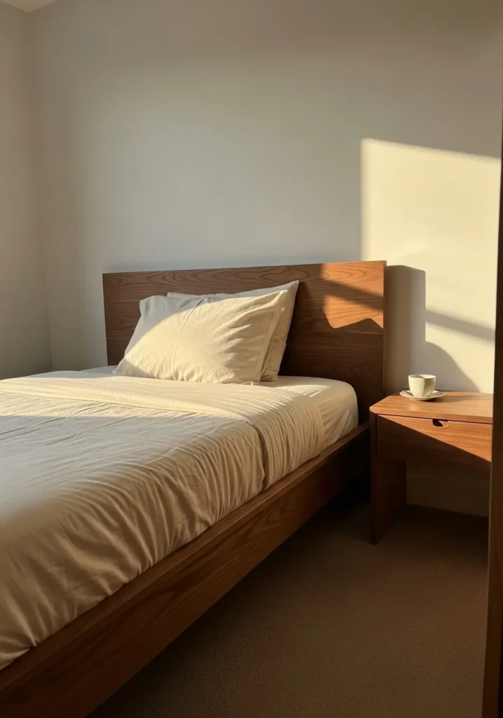 I honestly love how this room feels like a quiet moment at the end of a long day. The warm walnut bed frame looks sturdy yet relaxed, and that golden light makes everything feel extra cozy. It is the kind of bedroom that makes you want to slow down, fluff the pillows, and enjoy the calm without rushing anywhere.