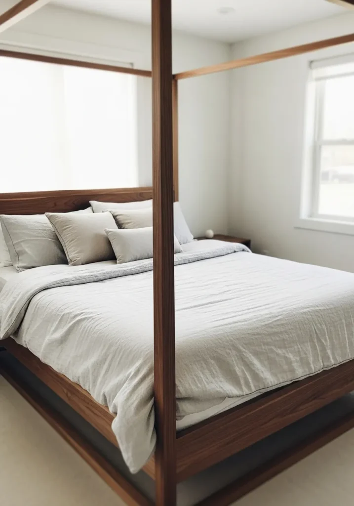 This bedroom features a warm walnut bed frame with a sleek canopy structure that adds height and presence without feeling heavy. The clean vertical posts and simple lines keep the look modern, while the rich walnut tone brings warmth and depth to the space. Soft neutral bedding and layered pillows balance the strong frame, and natural daylight from the windows keeps everything feeling open and airy.