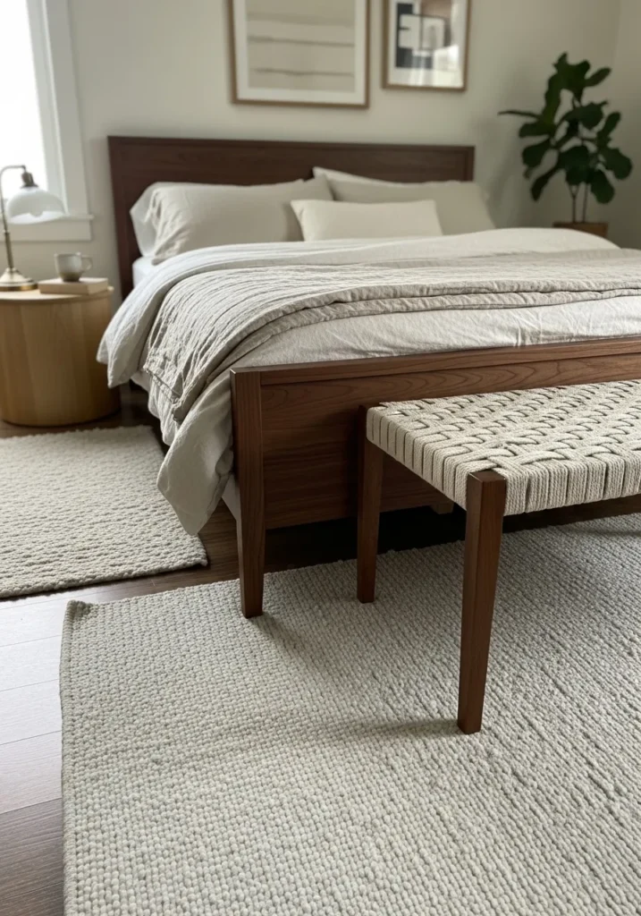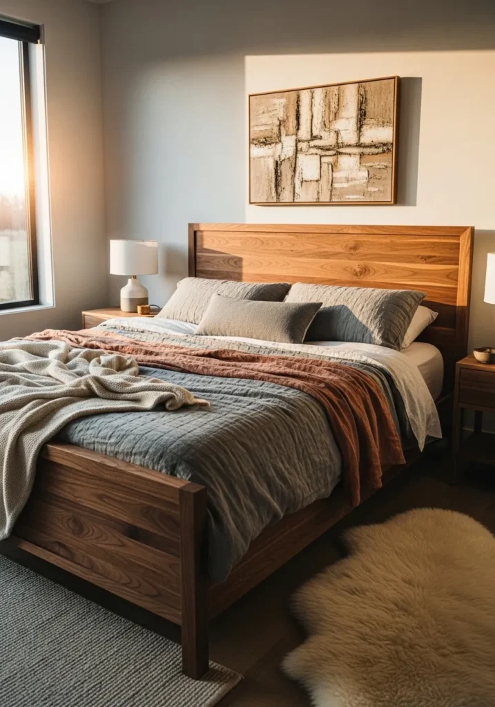 Cozy Layered Textures Around a Walnut Bed Frame
