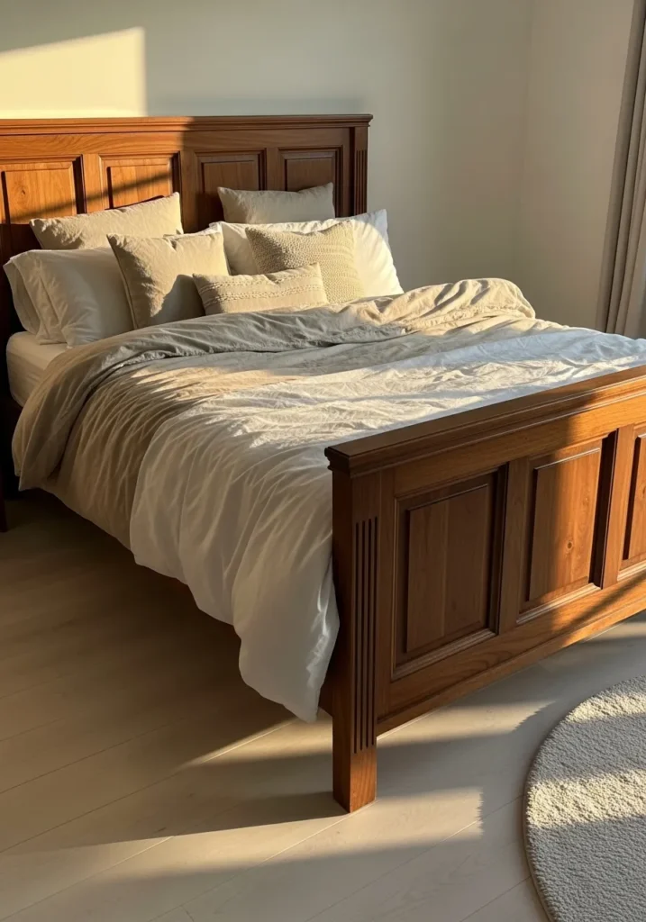 This bedroom showcases a warm walnut bed frame with beautiful panel detailing that gives it a timeless and substantial feel. The tall headboard and matching footboard add structure and presence, while the natural wood grain keeps the look warm and inviting. Soft neutral bedding and layered pillows balance the bold frame, and sunlight washes across the wood, highlighting every detail in a way that feels cozy and elegant.