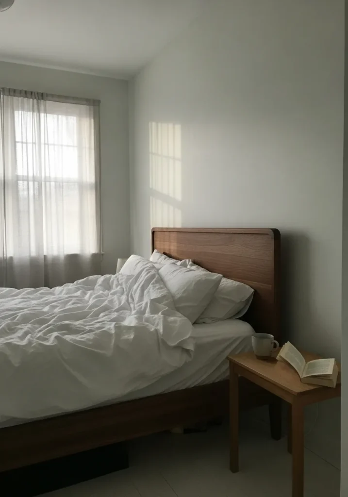This bedroom feels calm and softly lived in with a warm walnut bed frame that keeps the look grounded and natural. The smooth headboard adds warmth against the pale walls, while slightly rumpled white bedding gives the space an effortless and cozy feel. Sheer curtains filter in gentle daylight, casting soft shadows that make the room feel peaceful and relaxed. A small wooden side table with a book and mug adds a touch of everyday charm.