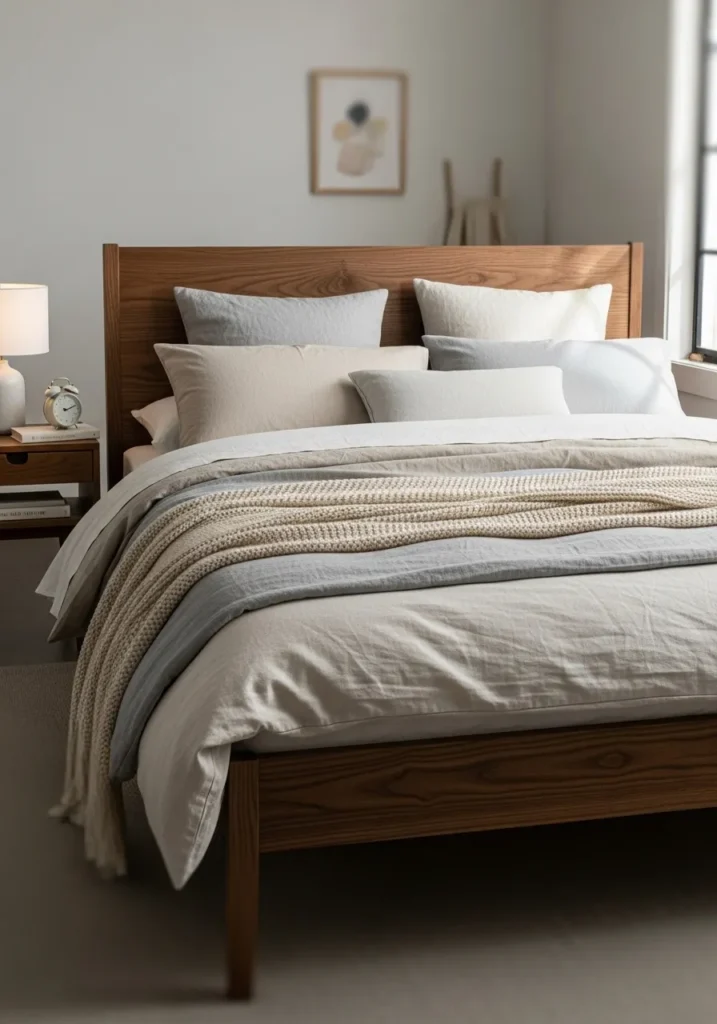 Soft Neutral Layers With a Warm Walnut Bed Frame