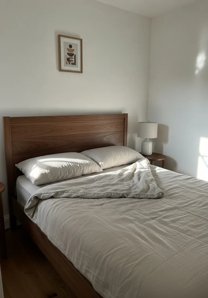 This bedroom keeps things simple and soothing with a warm walnut bed frame that sits low and feels effortlessly grounded. The smooth wood finish adds warmth against the pale walls, while soft white bedding keeps the look light and relaxed. A small walnut nightstand and simple ceramic decor add just enough detail, and the natural light from the window casts gentle shadows that make the space feel calm and lived in.