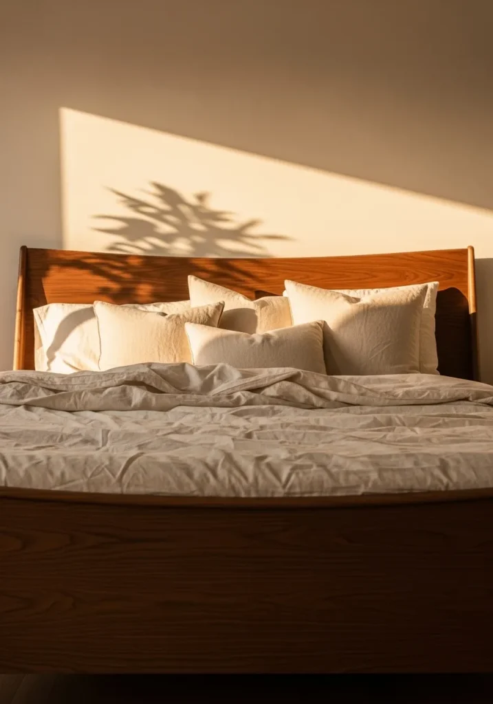 This bedroom feels intimate and softly dramatic with a warm walnut bed frame that glows in the late afternoon light. The smooth curved headboard adds a gentle elegance, while layers of creamy pillows and relaxed bedding keep the look cozy and inviting. Sunlight stretches across the wall, casting organic shadows that highlight the rich walnut tone and create a calm, almost cinematic mood. The overall styling stays simple, letting light and texture do the heavy lifting.