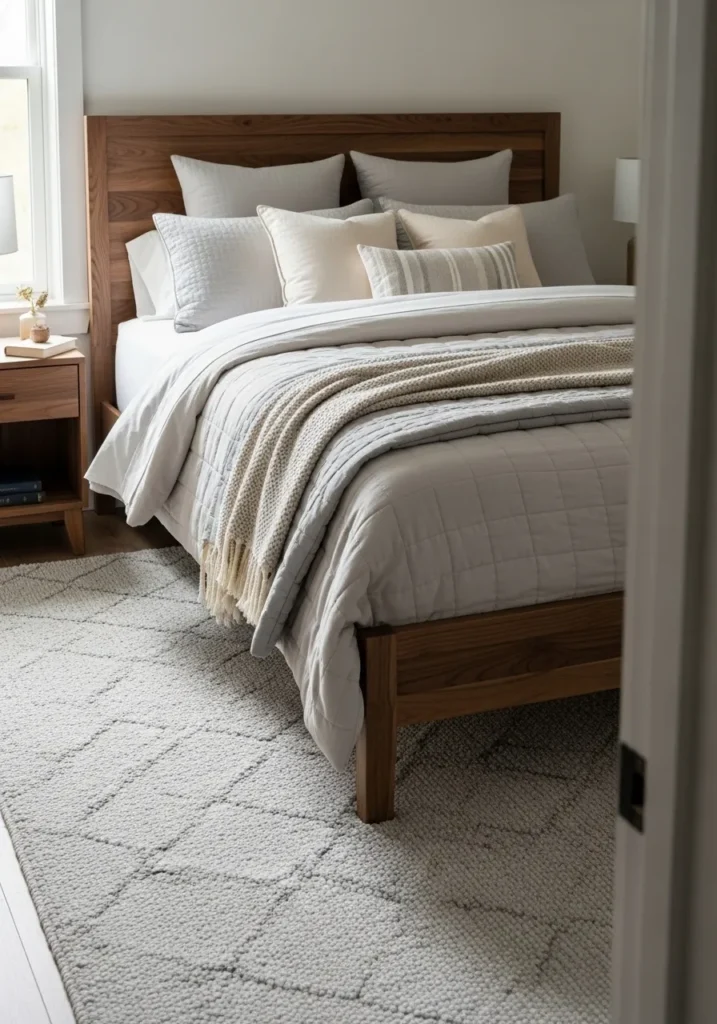 This bedroom feels warm and welcoming with a solid walnut bed frame that brings richness to the soft neutral palette. The clean headboard highlights the natural wood grain, while layered bedding in whites and gentle grays creates a plush and cozy look. A textured throw and mix of pillows add depth, and the light area rug softens the space underfoot. Simple nightstands and minimal decor keep the room feeling calm and uncluttered.