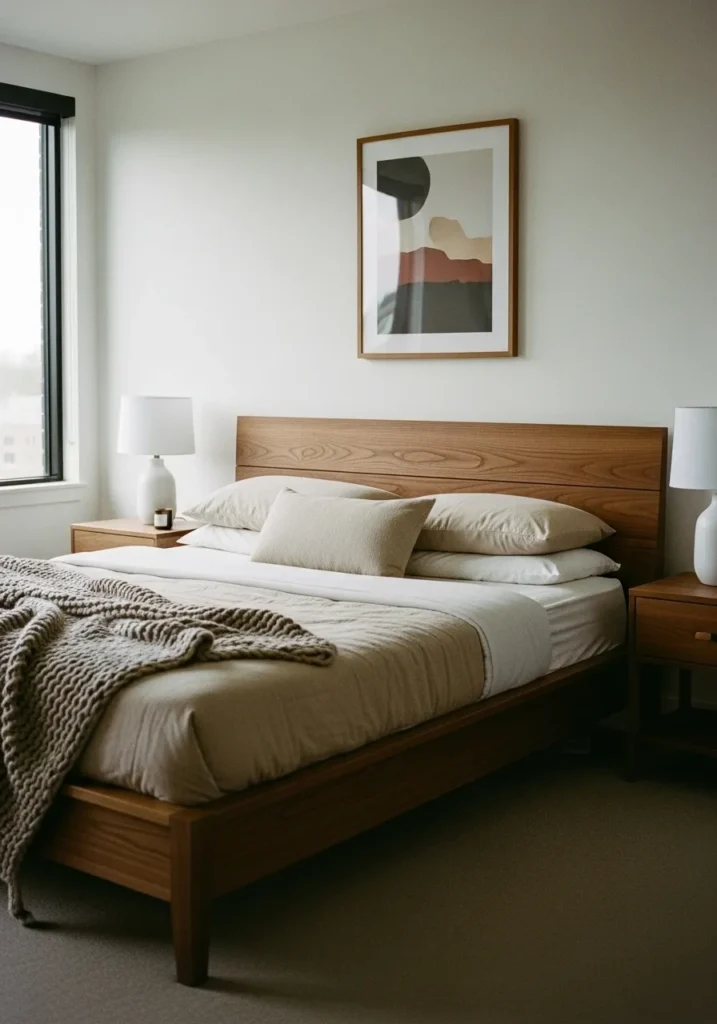 This bedroom blends clean lines and cozy warmth with a sleek walnut bed frame that feels both modern and timeless. The wide headboard shows off subtle wood grain, adding richness without overpowering the space. Soft beige bedding and a chunky knit throw bring in texture, while simple lamps and framed art keep the look balanced and calm. Natural light from the window brightens the room and makes the walnut tones feel even warmer.