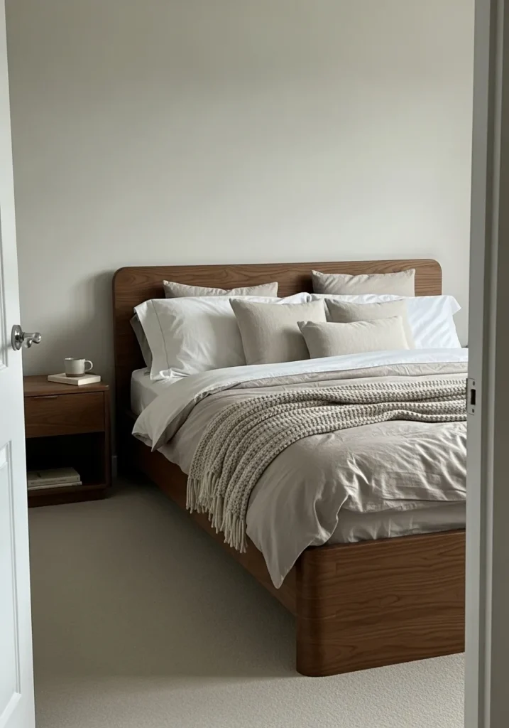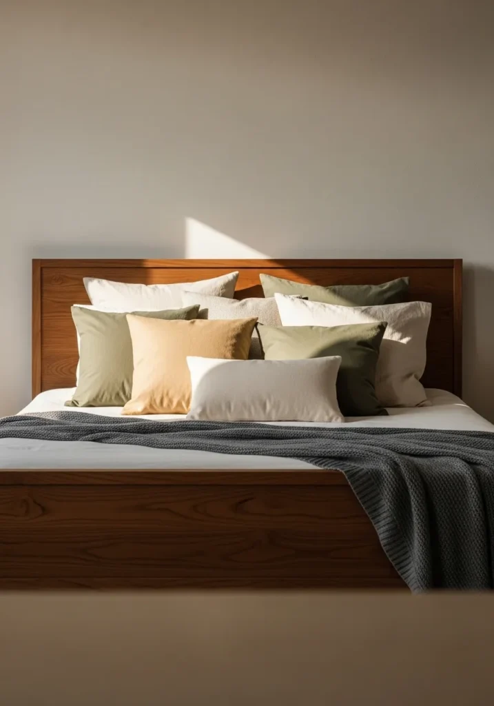 This bedroom centers around a warm walnut bed frame with a clean wide headboard that feels solid yet relaxed. Layers of pillows in cream sage and soft sand tones add depth without clutter. A simple knit throw draped at the foot brings texture while the smooth walnut grain grounds the whole look. The neutral wall color and gentle light keep the focus on the bed and its inviting layers.
