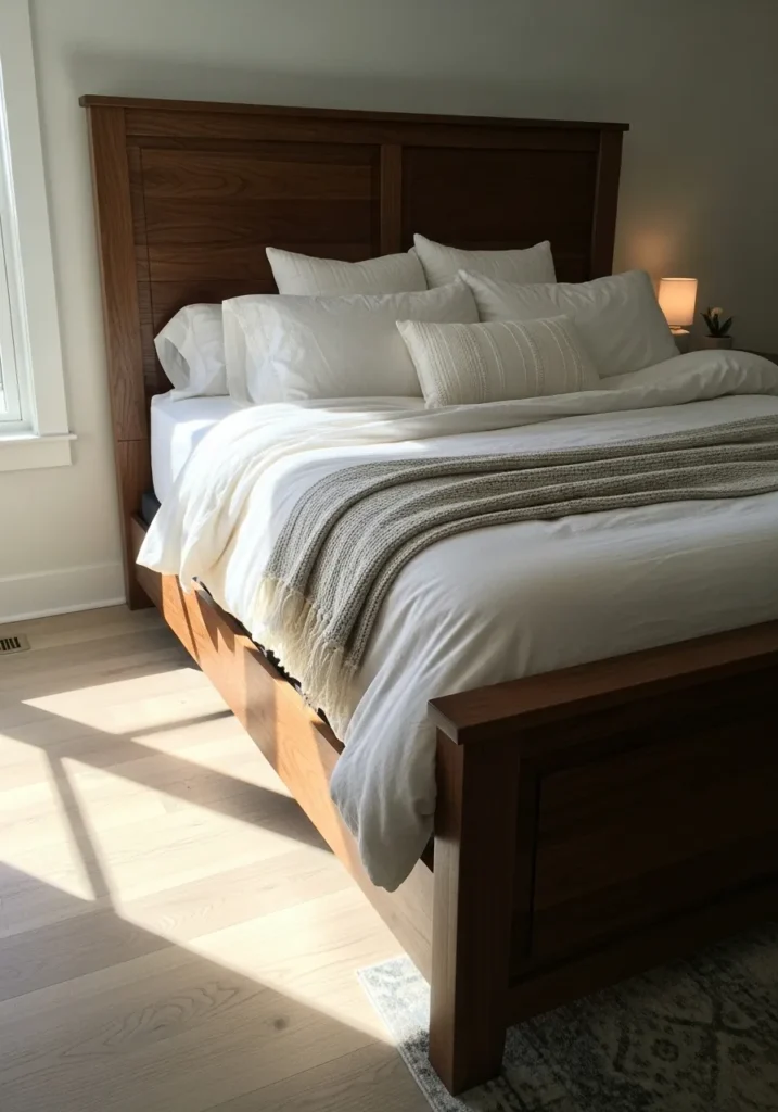This bedroom highlights a beautifully crafted walnut bed frame with a tall paneled headboard that feels sturdy and timeless. Crisp white bedding keeps things fresh while layered pillows and a soft knit throw add gentle texture. Warm wood tones balance the light flooring and walls, and the soft glow from the bedside lamp makes the space feel calm and welcoming without feeling heavy.