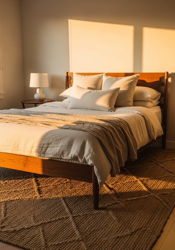 I really love how peaceful this room feels without trying too hard. The warm walnut bed frame looks beautiful in that golden light, and the simplicity makes everything feel more relaxed and real. It feels like the kind of bedroom where mornings start quietly and evenings feel cozy without needing anything extra.