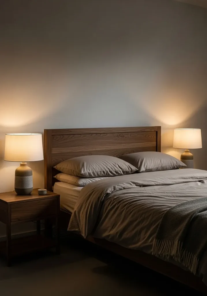 Soft Evening Light With a Balanced Walnut Bed Frame