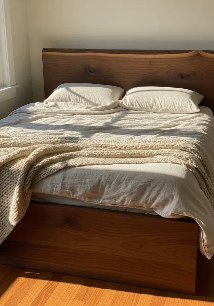 This bedroom puts the spotlight on a warm walnut bed frame with a thick headboard that proudly shows off natural knots and flowing wood grain. The low sturdy base adds a grounded feel, while soft white bedding and a chunky knit throw bring in texture and comfort. Sunlight hits the bed just right, warming up the wood tones and making the whole space feel relaxed and quietly inviting. The simple walls and clean floor keep the focus on the beauty of the walnut.