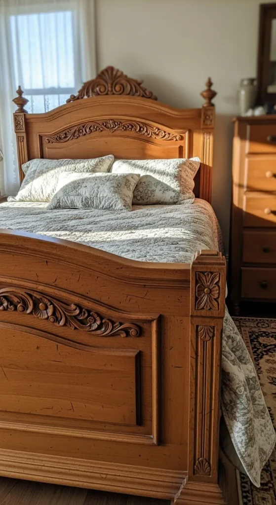 This bedroom feels rich and full of character thanks to a beautifully carved wood bed frame that instantly draws the eye. The warm wood tone highlights every decorative detail from the curved headboard to the sculpted footboard. Soft patterned bedding adds a gentle contrast while natural light brings out the depth and texture of the wood. Traditional furniture and cozy fabrics complete the look and give the room a sense of history and comfort.