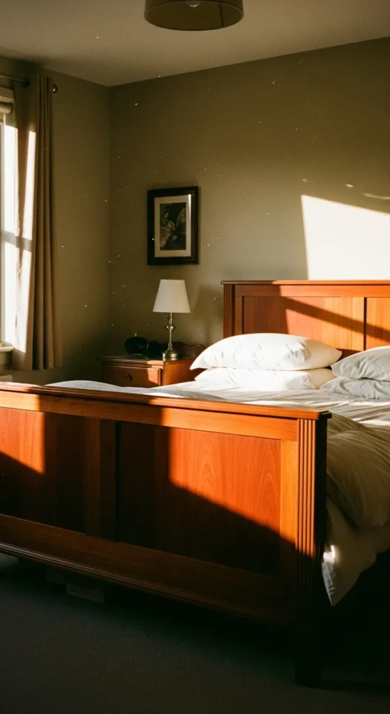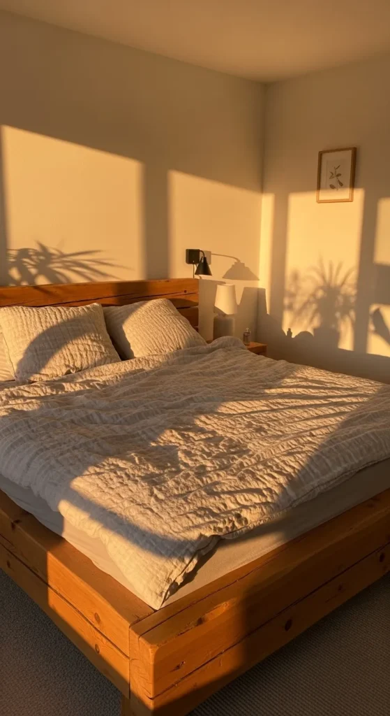 This bedroom feels soft and inviting with a sturdy warm wood bed frame that instantly grounds the space. The natural wood tone glows beautifully as golden sunlight fills the room and casts gentle shadows on the walls. Simple bedding in creamy neutrals keeps the look relaxed and easy, while minimal decor lets the light and textures do all the work. Everything feels calm and real, like a bedroom that is actually used and loved every day.
