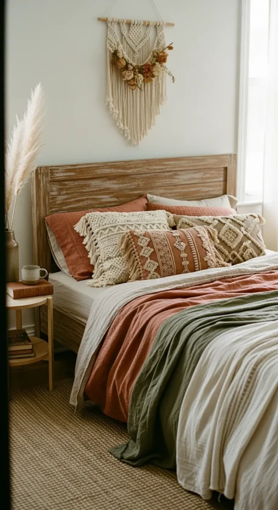This bedroom feels warm and inviting with a softly weathered wood bed frame that sets the tone for a relaxed boho look. The wood has a gentle worn finish that pairs beautifully with layered textiles in earthy tones like rust, cream, and olive. Patterned pillows and a cozy throw add depth and softness, while simple decor and natural fibers keep the space grounded and calm. Everything works together in an easy way that feels collected over time rather than styled all at once.